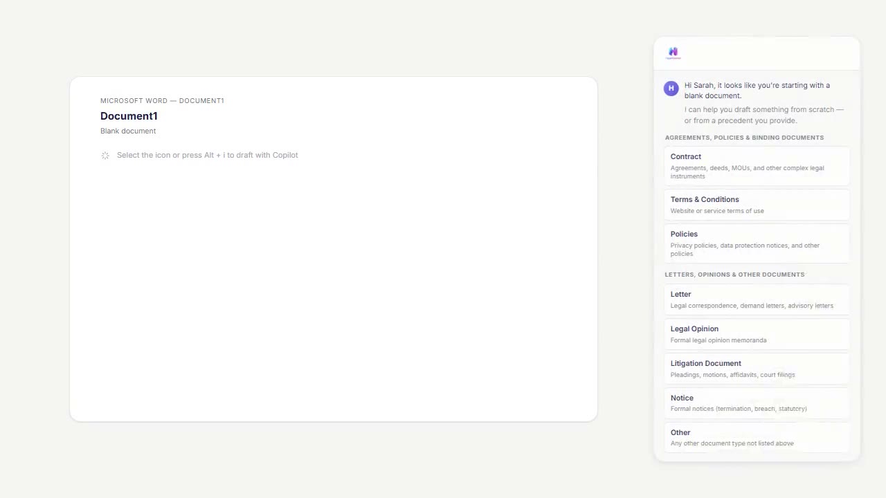 Complex agreements, legal opinions, demand letters — the AI asks clarifying questions, plans the sections, and drafts the document. Optionally upload a precedent to match your firm's formatting and tone.