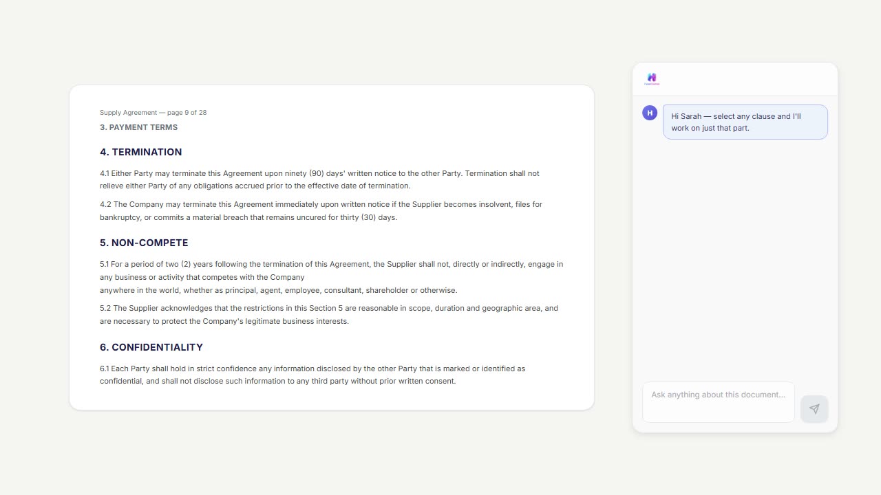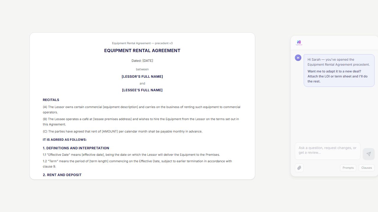 Your best clauses from your best deals - searchable and auto-matched. Upload your contracts, AI extracts and categorises every clause. Smart Match suggests relevant precedent language when you're drafting or reviewing.