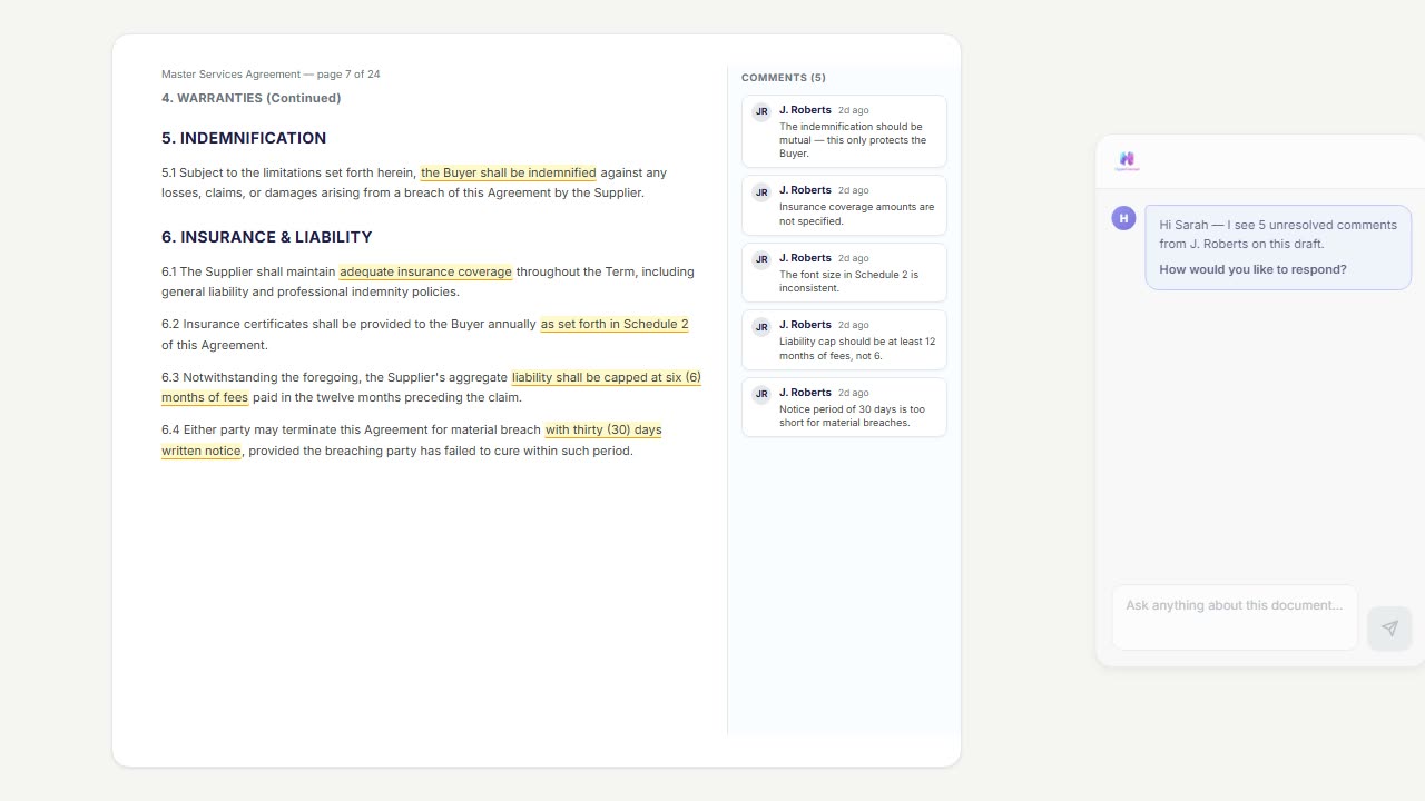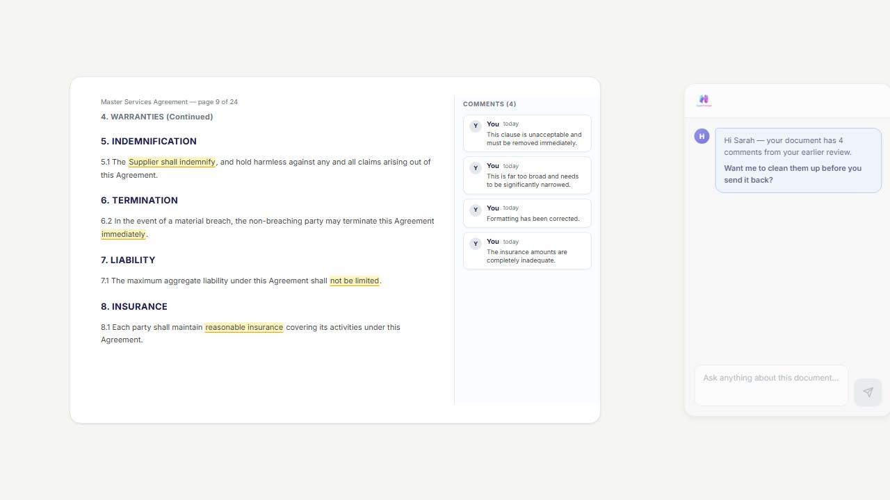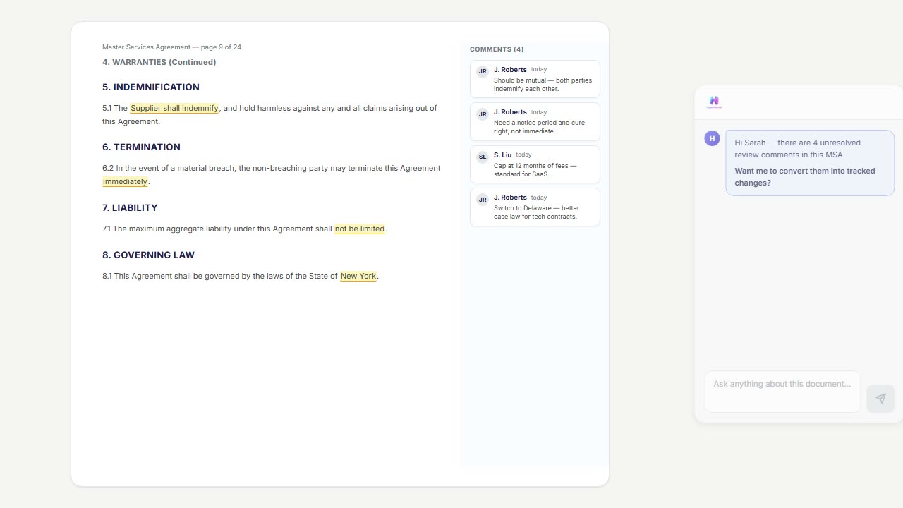 "Soften the tone." "Delete the resolved ones." "Reword comment 3 to reference clause 7." Bulk comment operations with full undo on every change.